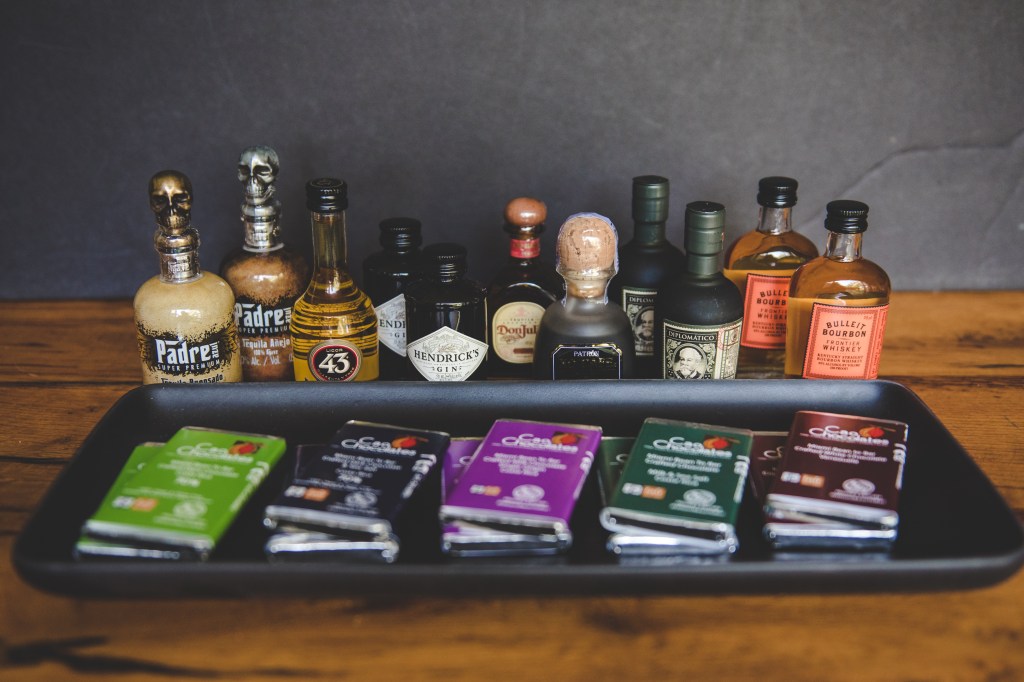 Mini chocolate bars from Cao Chocolates and most of the mini bottles are from Total Wine.