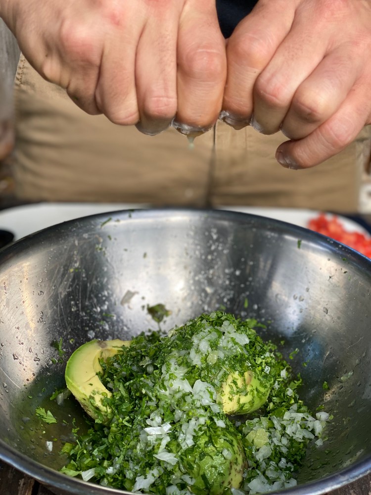 Preparation: Cut the avocados in half, remove the seed and set it up. One trick that’s not too bad is to put the seed in the center of the guacamole so that the avocado doesn’t brown so fast. We remove the peel from the halves of the avocados and the meat from the avocado we put it in a bowl where we mash it with a fork and spray it with the lemon so that it does not brown. Chop coriander/cilantro and onion then add it to the mashed avocado and stir everything well. That way we’ll get the guacamole ready. Just place the mixture of all the ingredients in a serving bowl and remember to place the seed in the middle bowl so that it stays longer without browning.