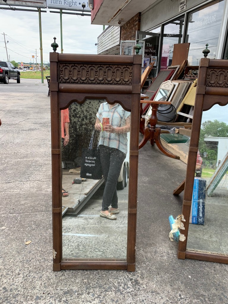 I saw a pair of wood framed mirrors. Dusty and dirty but I saw the potential. They were meant to be free standing mirrors and had a pole in the back to hold itself up, like a tripod. I knew that this would be my first flipping project.