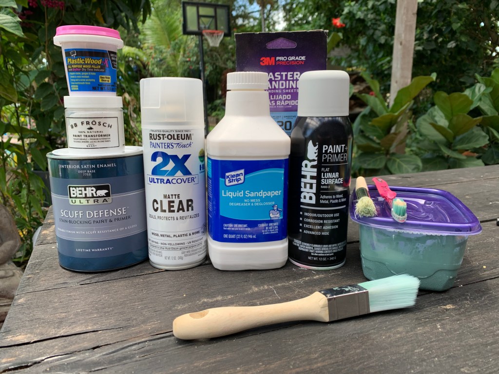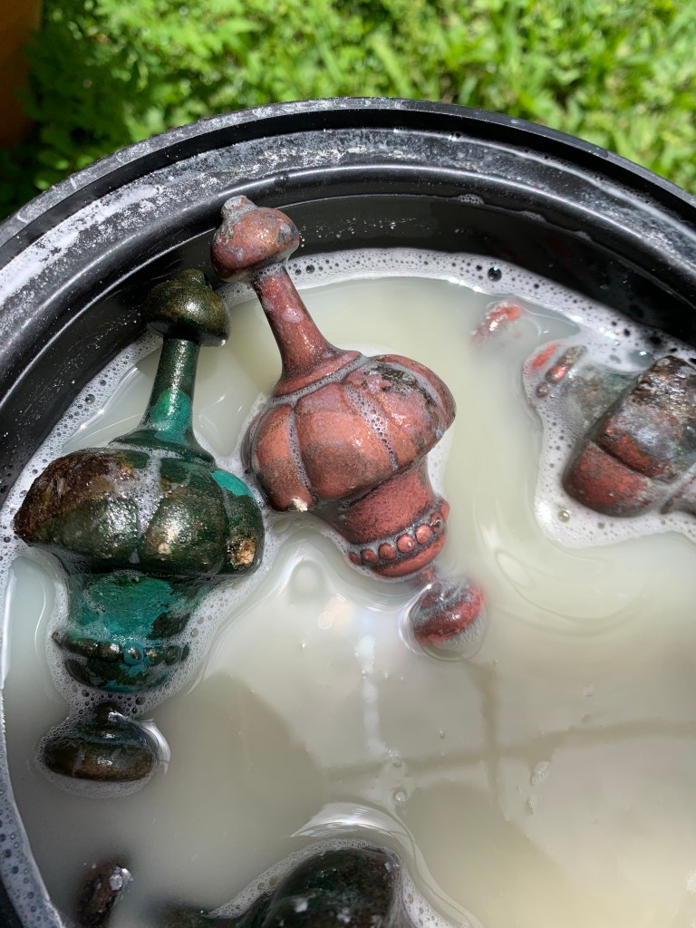 First I took off the finials and its 3rd leg stand thing. The finials were black and a little corroded, though in some spots I saw a beautiful greenish patina. I was tempted to leave them this way. I figured if I’m gonna flip, I’m gonna flip all the way, right? Eddie had suggested I soak them in Bar Keeper’s Friend (he took over this part for me). The four finials soaked for a few days (see photos below) while I worked on the mirrors. I had fine 150 grit sand paper (which I think was too fine) and started sanding away. Music, nice morning weather and mosquitos. I sprayed myself with repellent but those mozzies were not forgiving. Kept sanding, then at this point I was getting hot. Hot and bothered I took a break. I came back and thought that I should have taped the mirror to protect it incase that I scratched the mirror with the sandpaper. So I taped it with blue painter’s tape and called it a day. Repeat second day. Sanding, mosquitos and sweat. I had seen in one of the Youtube furniture flippers use liquid sand paper. Music to my ears. Home Depot was the next stop. I lathered that liquid sand paper all over the wooden frame. I brushed the whole frame with an old toothbrush and wiped it clean with a clean cloth. And wiped again and again. I felt I had done enough prep to get to the next stage.