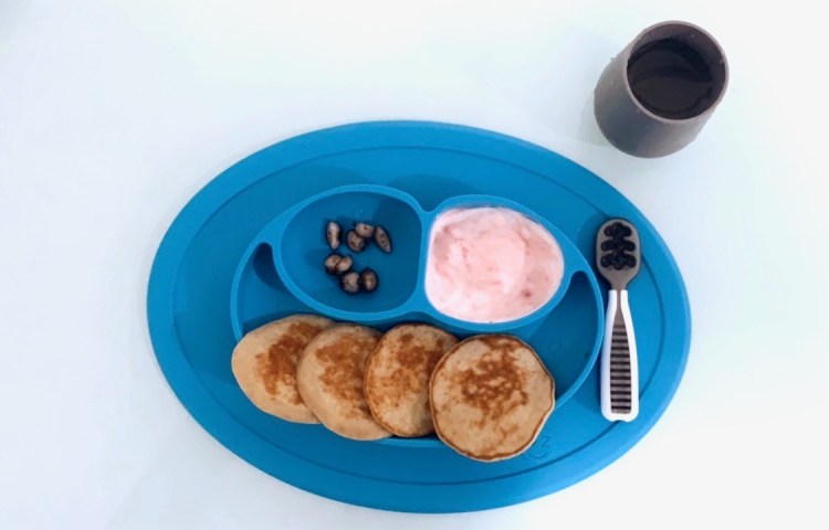 Take the banana and mash it until almost pureed. Crack one egg and whisk until all ingredients are blended, add 1 oz of breast milk and finish off with 2 table spoons of your choice of flour. Let rest for 2-3 minutes. On a hot stove bring a skilet on medium heat, using a table spoon pour small little batches and let cook for 2 mins on each side or until golden brown. Offer dipping sauce on the side for added yumminess by taking berries of your choice mashing them and mixing with Greek yogurt!