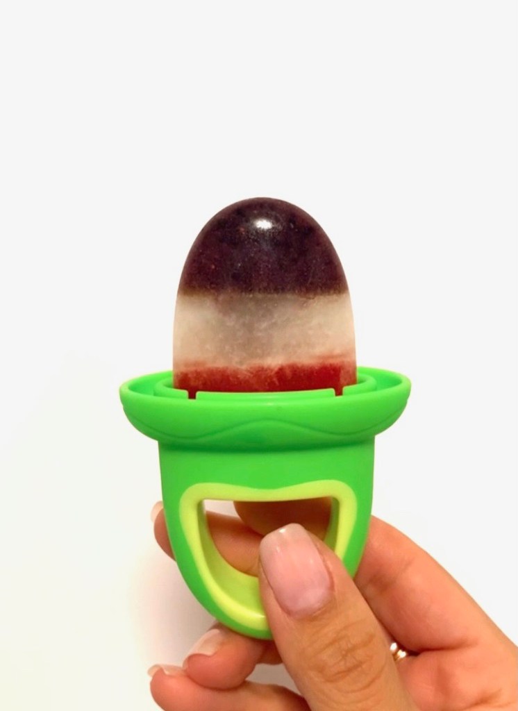 Purees fruits of your choice I like using the Nuby Garden Fresh Tray to make my popsicles. These are great for teething babies, add some fruit if your little one is over 6 months and has been introduced to solids already. If you are adding fruits, I like to make three tiered popsicles. I begin with pureed blueberries, allow 30 mins to freeze, then add breast milk, freeze for 30 mins and finish off with strawberry puree! Make sure to include handle when the last layer has been added