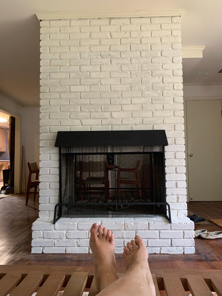 This fire place in close inspection looked like pigeons pee’d down two sides of the brick wall. You know, the kind you see on the outside of an old building or a train station. As much as I love the brown brick, it looked clunky in the room, not to mention dirty. I took to scrubbing with a bathroom scrubbing brush with Borax and dishwashing liquid – a concoction I saw on Pinterest. I was excited because it was starting to look less like a bird urinal and looking like it had a make over. Then, the damp brick dried and my scrubbing did little to nothing. It re-exposed the unsightly drip. This sealed the deal for me to white-wash the brick. Since I scrubbed the brick clean already, I was already to get to the fun part of painting.